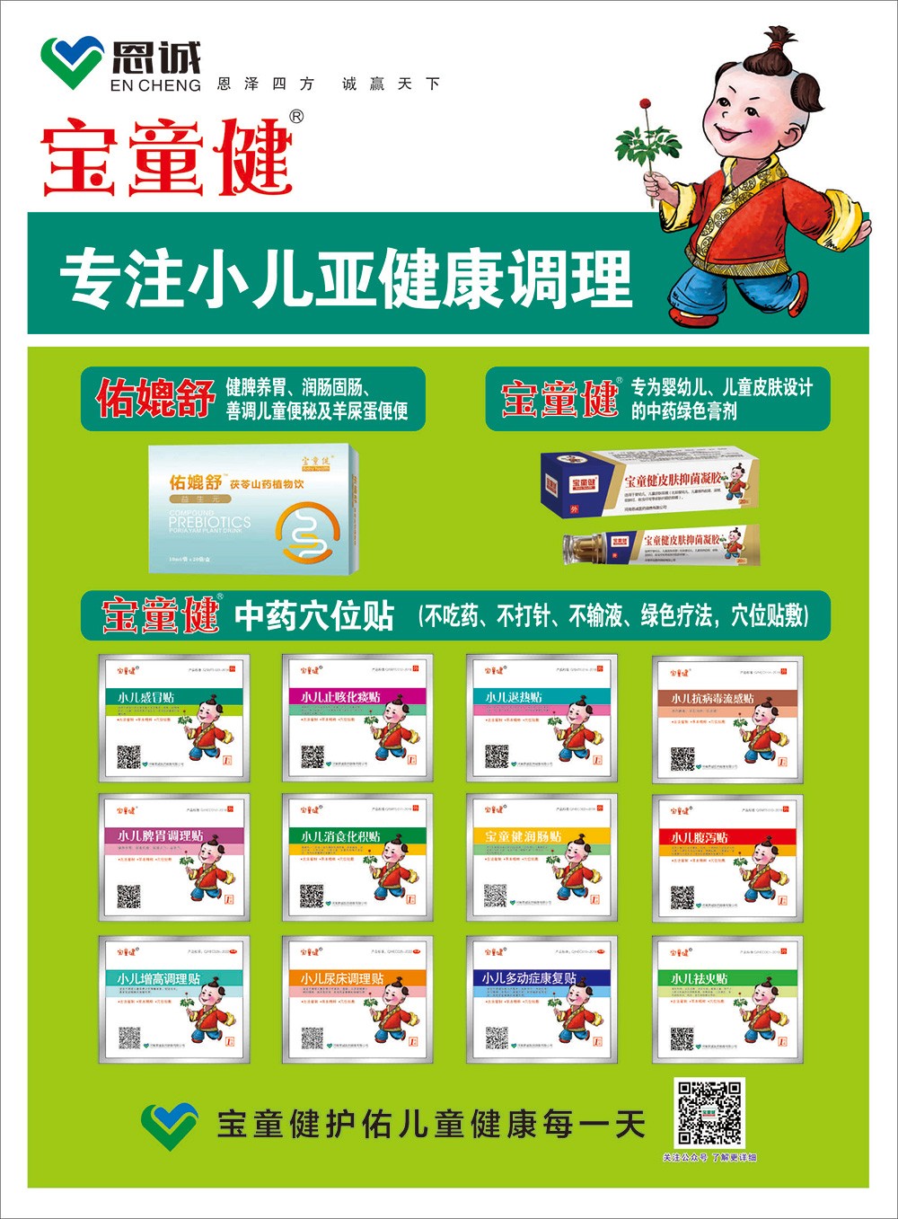 品牌名稱:寶童健 主營產(chǎn)品:寶童健小懸灸,寶童健中藥穴位貼,寶童健抑菌凝膠 品牌特色:傳承延續(xù)+綠色健康