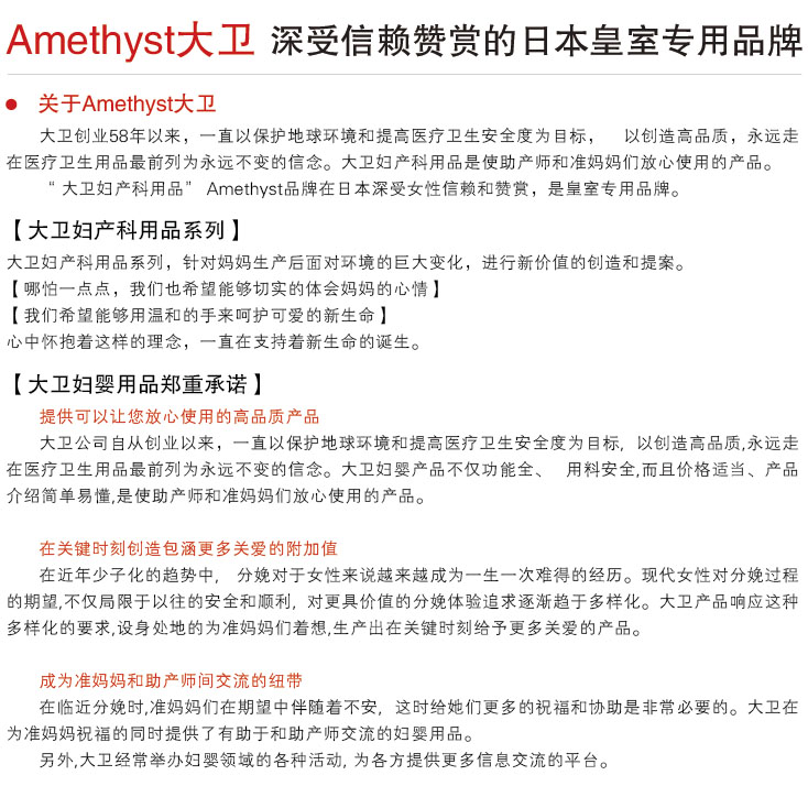 大衛(wèi)公司自從創(chuàng)業(yè)以來(lái),一直以保護(hù)地球環(huán)境和提高醫(yī)療衛(wèi)生安全度為目標(biāo),以創(chuàng)造高品質(zhì),永遠(yuǎn)走在醫(yī)療衛(wèi)生用品最前列為永遠(yuǎn)不變的信念。大衛(wèi)婦嬰產(chǎn)品不僅功能全、用料安全,而且價(jià)格適當(dāng)、產(chǎn)品介紹簡(jiǎn)單易懂,是使助產(chǎn)師和準(zhǔn)媽媽們放心使用的產(chǎn)品。