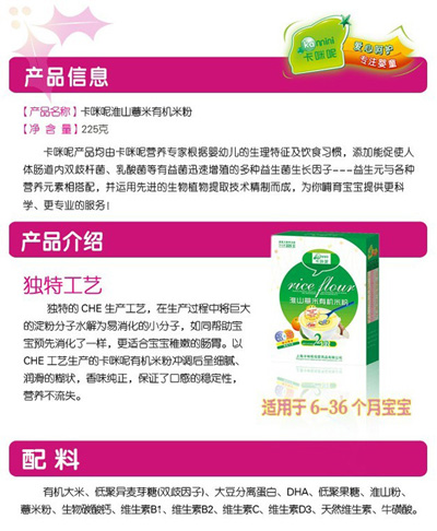 卡咪呢有機(jī)米粉系列是專為中國寶寶設(shè)計的營養(yǎng)輔食,選用有機(jī)大米,科學(xué)搭配維生素AD等維生素,還特別添加;撬、DHA、AA等有助智力發(fā)育的營養(yǎng)成分,富含15種營養(yǎng)素。現(xiàn)上?ㄟ淠啬笅胗闷酚邢薰久嫦蛉珖瞻资袌鰠^(qū)域誠招卡咪呢有機(jī)米粉代理商。