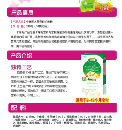 卡咪呢有機米粉系列是專為中國寶寶設(shè)計的營養(yǎng)輔食,選用有機大米,科學(xué)搭配維生素AD等維生素,還特別添加牛磺酸、DHA、AA等有助智力發(fā)育的營養(yǎng)成分,富含15種營養(yǎng)素。現(xiàn)上?ㄟ淠啬笅胗闷酚邢薰久嫦蛉珖瞻资袌鰠^(qū)域誠招卡咪呢有機米粉代理商。