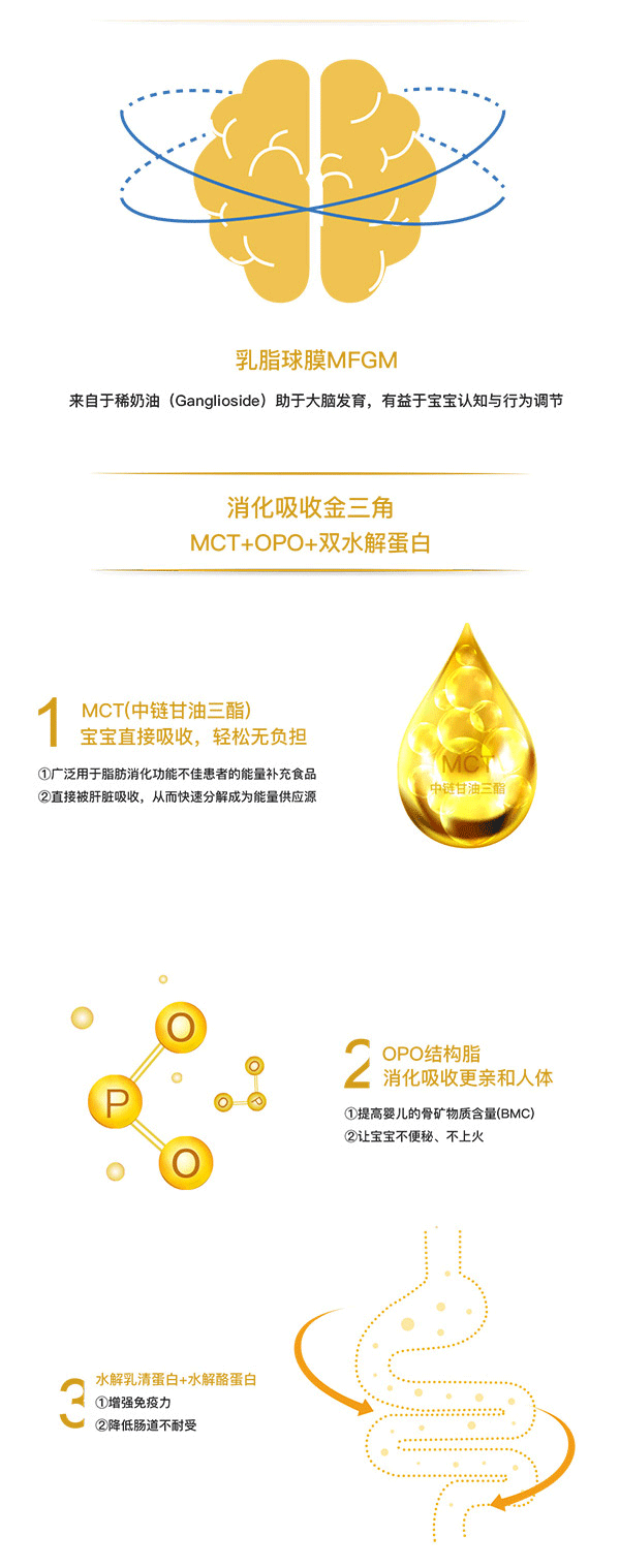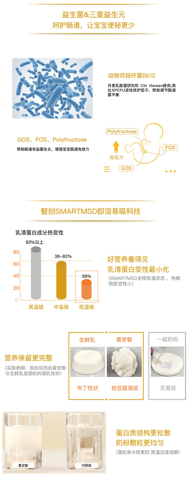 金裝喜安智嬰兒配方奶粉即溶優(yōu)吸收,寶寶少上火,采用創(chuàng)新科技優(yōu)異溶解技術(shù),是奶粉顆粒均勻蓬松,37°常溫水沖調(diào)可迅速徹底溶劑,即沖即飲,使容易變性的熱敏營養(yǎng)物質(zhì)(蛋白質(zhì)、鈣等)的營養(yǎng)損失小化,并大程度避免免疫物質(zhì)的失活,保障營養(yǎng)物質(zhì)的完整性和活性。