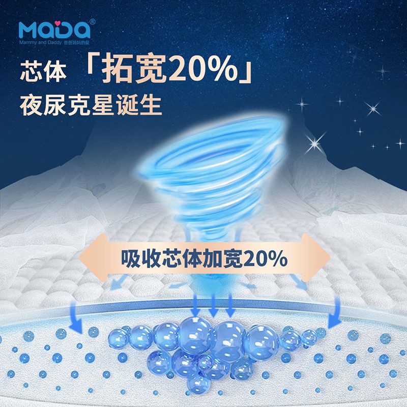 MaDa芯大系列褲型嬰兒紙尿褲,芯大20%,不漏好安心。薄若蟬翼,隔濕透氣,泡點觸膚,干爽舒適,云朵腰圍,柔軟不勒,芯體加寬,瞬吸瞬干。