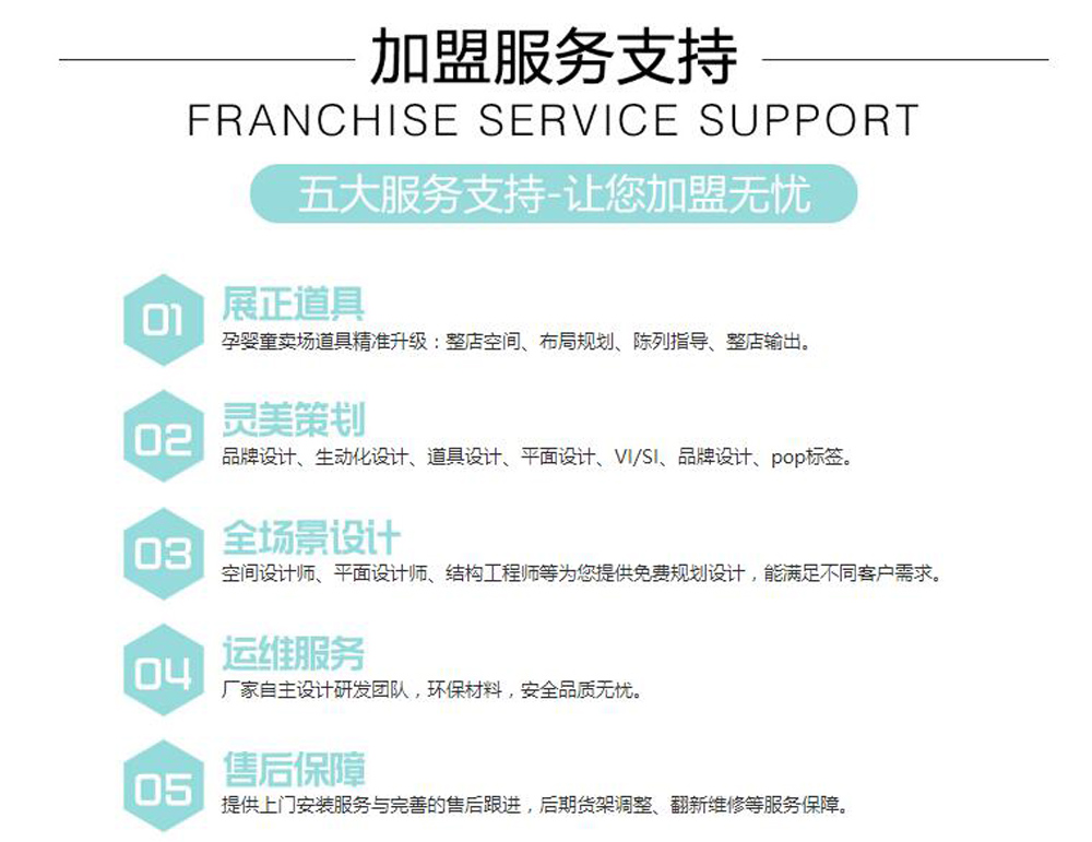 公司推出“母嬰終端零售展示道具、母嬰終端代理商、專營店、品牌連鎖加盟的整店輸出一站式服務(wù)”。公司不但擁有高素質(zhì)的設(shè)計團(tuán)隊:空間設(shè)計師、平面設(shè)計師、結(jié)構(gòu)工程師等為您提供免費(fèi)規(guī)劃設(shè)計,能滿足不同客戶需求,真誠感謝長期支持和信賴,我們的朋友!