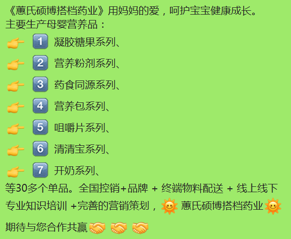 主要生產(chǎn)母嬰營養(yǎng)品∶凝膠糖果系列、營養(yǎng)粉劑系列、藥食同源系列、營養(yǎng)包系列、咀嚼片系列、清清寶系列、開奶系列、等30多個單品。全國控銷+品牌+終端物料配送+線上線下專業(yè)知識培訓(xùn)+完善的營銷策劃,焱蕙氏碩博搭檔藥業(yè)燃期待與您合作共贏