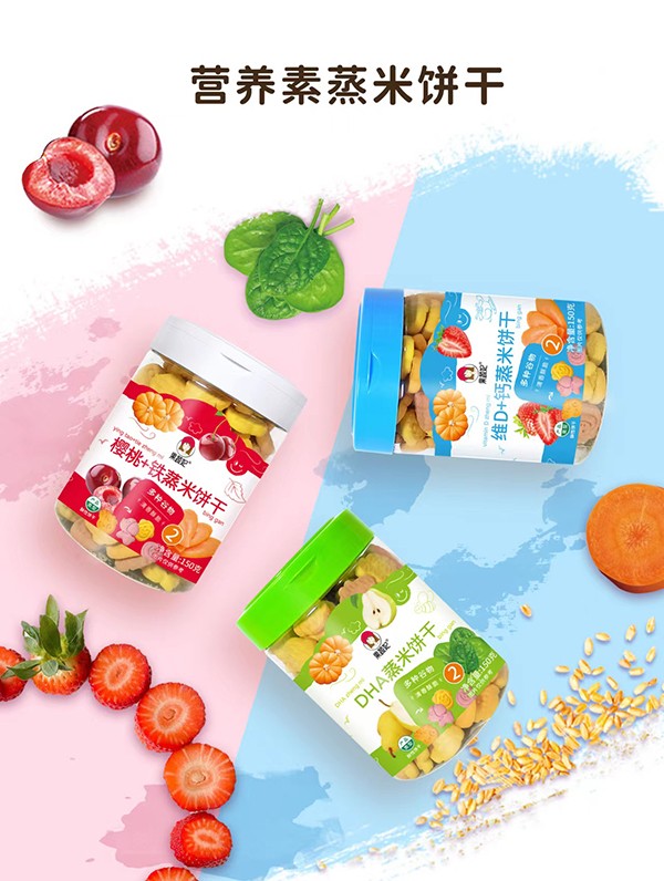 果蔬妃【營養(yǎng)素蒸米果蔬餅干】是融合了多種谷物和果蔬成分的小動物造型餅干,采用蒸米工藝,清香酥脆,口齒留香!特別加入營養(yǎng)素,營養(yǎng)更豐富,有DHA、櫻桃+鐵和維D+鈣3種口味,適合9個(gè)月以上寶寶食用。