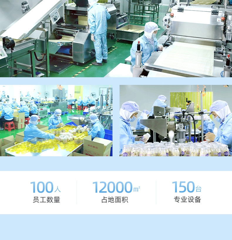漳州童世界食品有限公司主營一站式代加工OEM業(yè)務,致力于健康兒童食品、功能性代餐食品、凍干燕窩的研發(fā)與生產(chǎn),公司占地面積12000平方米,始終秉承已科技為先導、以先進的現(xiàn)代化管理依托、已“顧客滿意第一”為宗旨的經(jīng)營方針、致力發(fā)展成為一家研發(fā)和制造健康、美味、營養(yǎng)的食品企業(yè)。 公司的誠信、實力和產(chǎn)品質量獲得業(yè)界的認可。歡迎各界朋友蒞臨參觀、指導和業(yè)務洽談。