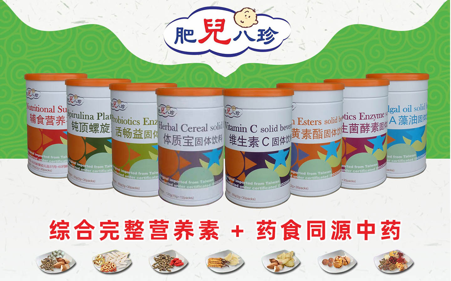 肥兒八珍藥食同源固體飲料系列有八款單品,分別是谷寶草本、輔食營養(yǎng)補充品、活暢益、維生素、DHA藻油、鈍頂螺旋藻、葉黃素酯、益生菌酵素。