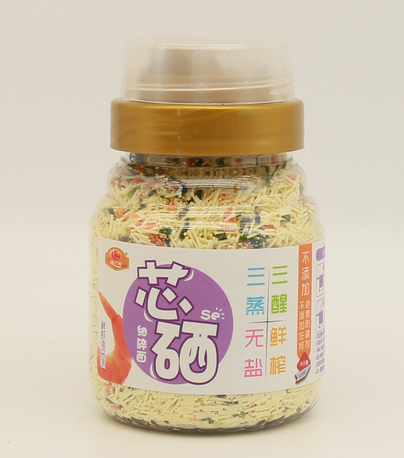 康廣利芯硒細(xì)碎面,采用麥芯粉、鮮榨蔬菜汁等優(yōu)質(zhì)食材制作,經(jīng)獨(dú)特用心調(diào)制,淡淡的雜糧和蔬菜香味進(jìn)入面條中,綠豆薏米菠菜味、五谷紅棗山藥味、鮮蝦海苔味、百合蓮子口味、多彩口味,多種不同口味,讓寶寶的味蕾開(kāi)始旅行。三醒三蒸,無(wú)鹽鮮榨,不含色素、防腐劑、增白劑,健康安全。易煮不渾湯,造型獨(dú)特,面體爽滑,口感美味。罐裝設(shè)計(jì),易于存儲(chǔ),干凈衛(wèi)生,食用方便。
